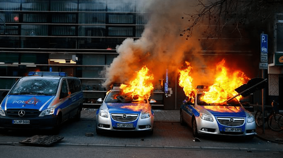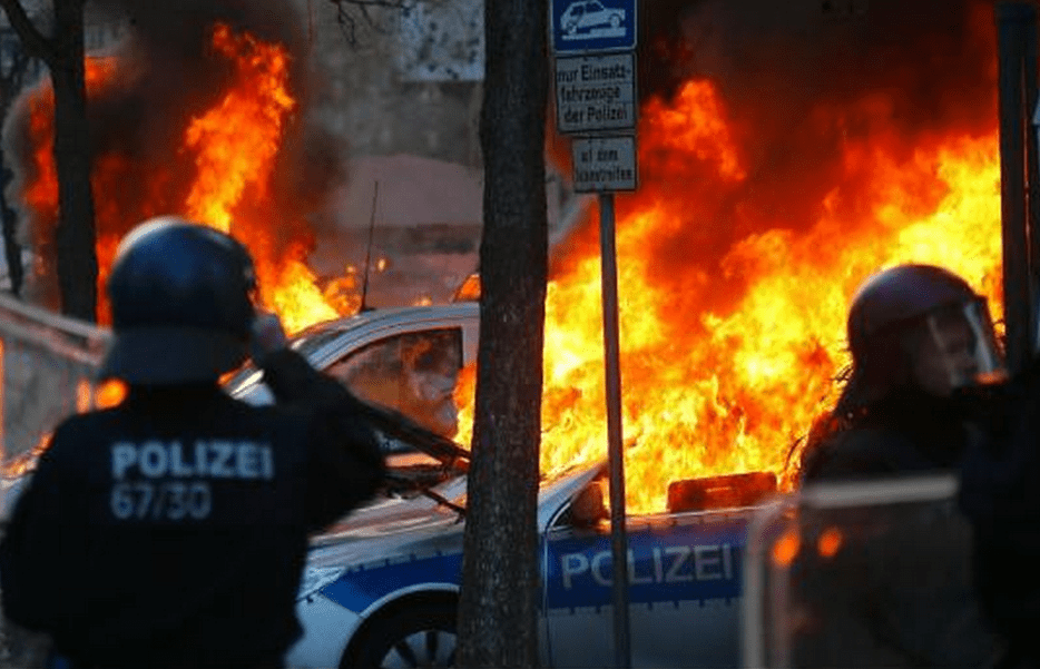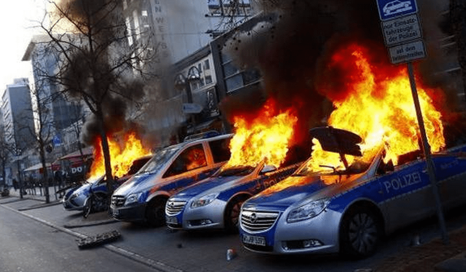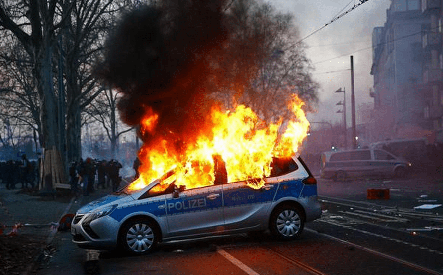As chamas arderam nesta quarta-feira (18) na cidade de Frankfurt, na Alemanha, durante o evento de inauguração da nova sede do Banco Central Europeu. Cerca de 10 mil pessoas compareceram ao evento marcado por danos à propriedade, detenções massivas e barricadas flamejantes.