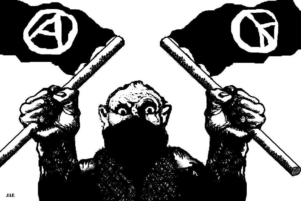 Chamamos de terroristas, algumas pessoas que dominam outras pessoas com bombas, tanques, armas, prisões,torturas e execuções, hospitais psiquiátricos e a mentira do inferno. Dizem que Anarquia é o caos, mas na sua sociedade capitalista é que vemos criminalidade, prostituição, desigualdade, destruição, ao mesmo tempo: excesso de comida e milhões de seres humanos morrendo de fome, bombardeios de povoados, cidades, países inteiros, arrasam tudo com sua ganância causando pânico geral.