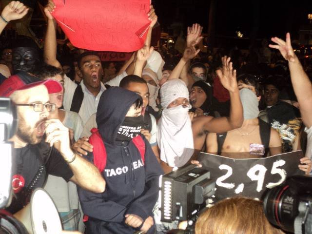 Protesto contra aumento de passagens Centro do Rio de Janeiro (10-06-2013) terminou em confusão a nova manifestação contra o aumento das passagens de ônibus no Rio de Janeiro, que subiram de R$ 2,75 para R$ 2,95 no sábado(8). Nesta segunda-feira(10), por volta das 16h30, cerca de 300 pessoas se reuniram nas escadarias da Câmara Municipal, na Cinelândia, Centro da cidade, onde começou o protesto, inicialmente pacífico.