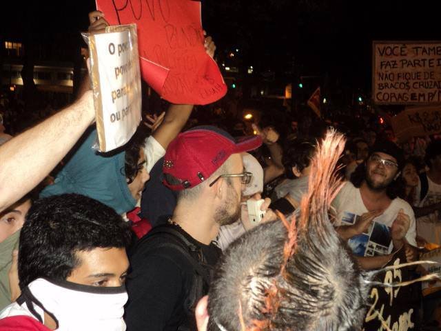 “Começou na cinelândia, estávamos indo em direção a candelária. Nem meia hora de protesto e a tropa de choque já estava em cima. Quando paramos em frente ao tribunal, houve a primeira prisão, a de um dos punks. Começou o caos daí. O pessoal que foi tentar impedir saiu levando spray e cacetada. O pessoal começou a correr e a juntar, e continuaram a gritar palavras de ordem meio andando, meio correndo quando explodia alguma coisa até a cinelândia. Pouco depois do tribunal, queimaram um desses cilindros de plástico laranja de orientação, e aí começou a destruição. O pessoal começou a quebrar e chutar lixo, pegar coco dos lixos e pedras e a revidar a polícia. A marcha foi até a pres. vargas aonde o pessoal, em pânico, se dispersou em três grupos. Vários foram detidos e machucados, dos mais de 2000 que foram.