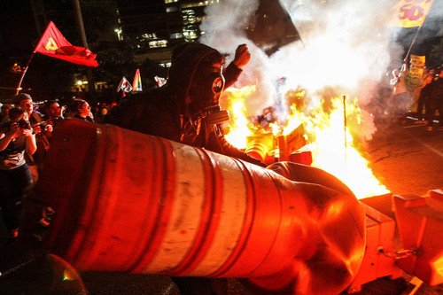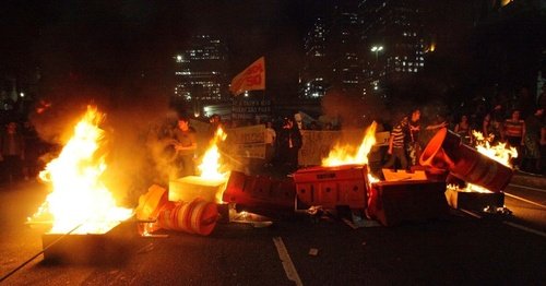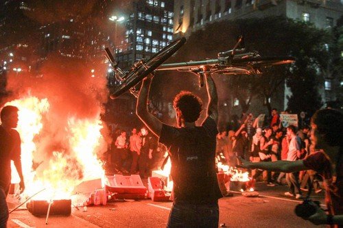 Os manifestantes resistiram bravamente levantando barricadas em chamas, lançando pedras e objetos e depredando ônibus e patrimônios das grandes empresas “amigas do estado.”